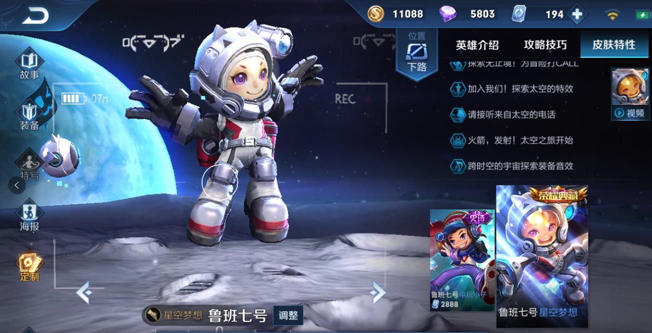 相比之下,同样科技感十足的星空梦想鲁班,就要华丽许多,身着太空服的萌萌造型,也是征服了不少妹子玩家的心。星空鲁班的登场非常有趣,游戏中的设定是鲁班在月球开了个直播,屏幕上还不断地有弹幕飞过。不过星空鲁班是荣耀典藏皮肤,同样不能直接购买。这两款皮肤比较的话,阿怪觉得还是星空鲁班更加精美一些,当年阿怪花199买了未来战士,基本上处于吃灰的状态,实战中阿怪更喜欢用EZ的暗杀星皮肤。