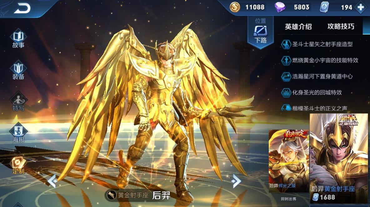 王者荣耀中单论特效能跟大元素使拉克丝媲美的不多,但一些具有特殊意义的皮肤,也是深受玩家喜爱的,比如黄金射手座后羿。圣斗士星矢的IP联动皮肤,为玩家还原了射手座的霸气形象,登场特效也是极致华丽。这个皮肤虽然没有多种形态,但就本身的精致程度来说,是不输给大元素使拉克丝的。