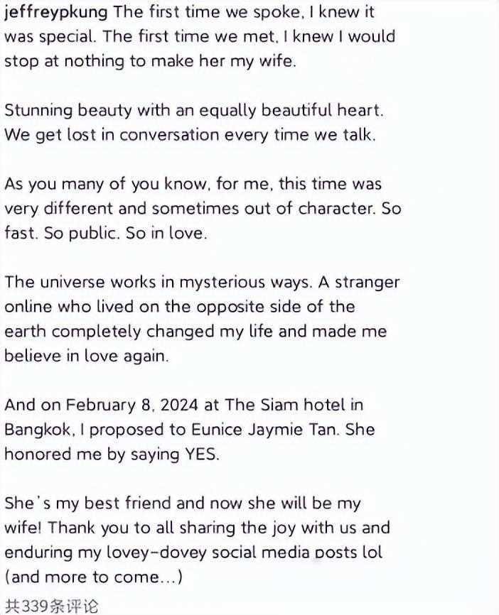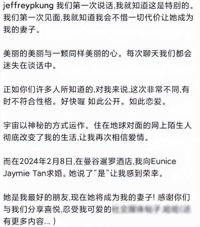 这段文字流露出了孔令奇对未来的期许和对爱情的信仰,让人不由得产生了对他们故事的好奇和探究的欲望。是什么让孔令奇如此坚定地选择了Eunice Jaymie Tan?他们之间的爱情究竟会走向何方?这些问题让人不由得想要深入阅读下去,探寻更多的答案。