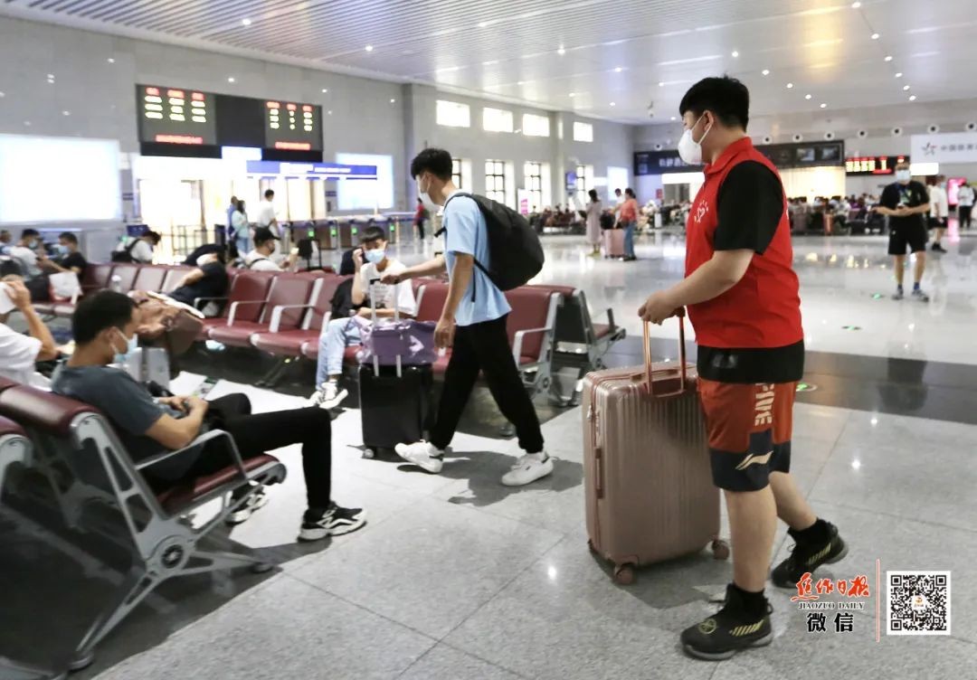 志愿者帮助乘客拿行李。