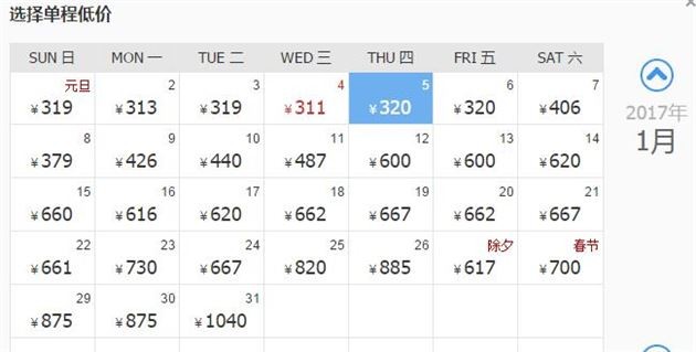 大河客户端编辑查询了1月5日郑州到昆明的机票,最低价仅320元,再加上其他费用,只有400多元;而除夕当天的机票最低800元左右,最高不超过2000元,但是郑州飞往昆明仅需三四个小时。