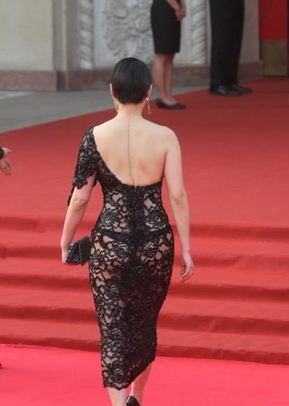 看后面竟也是露背的风格,袁立的多肉又丰腴的身材被展现到淋漓尽致,想这么修身的裙子要求体型完美,不过好像更适合袁立这种婀娜又多姿的体型,不得不说这身材与卡戴珊有一拼了。这件礼裙腰以下经是全”透视“的风格,这么大胆的风格就是袁立本人了吧,这也太敢了。