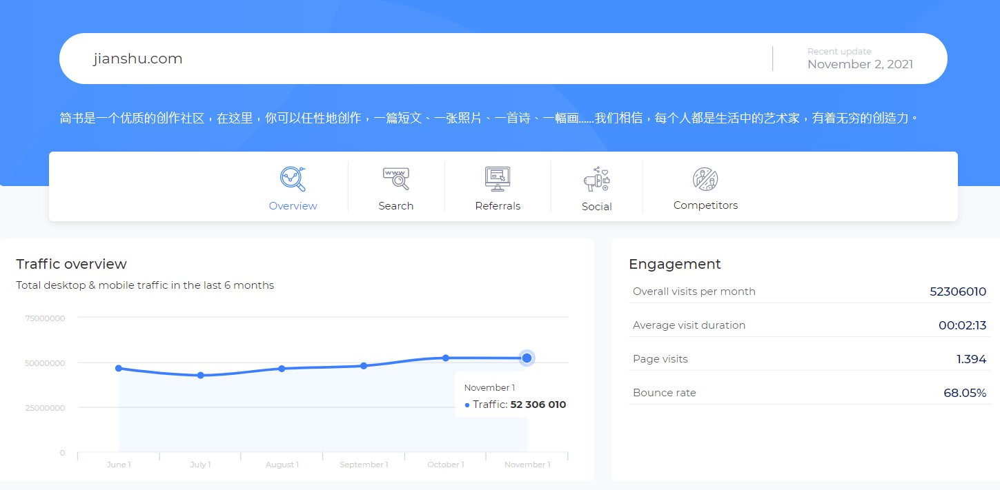 新浪博客有多憋屈?简书可以说是其最大的竞争对手,来看一下简书的造访人次数据: