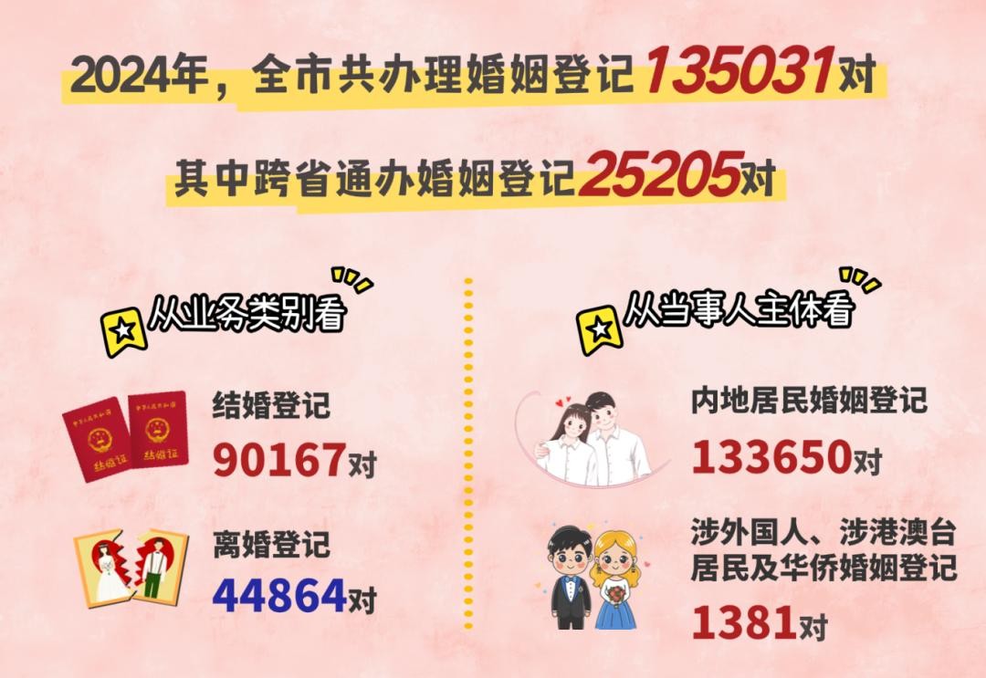 2024年上海婚姻登记数据公布:结婚登记90167对,初婚平均年龄30.1岁,其中男性30.8岁,女性29.5岁。