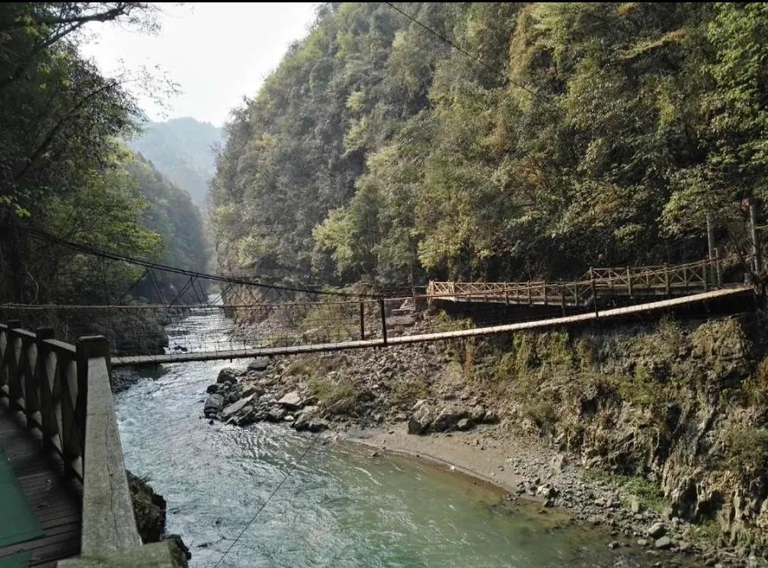 南江大峡谷全长40多公里,景区的游览路线非常简单,顺着南江在谷底徒步。地势逐渐走低之后,有崖边栈道供人行走,并有吊桥连接两侧的悬崖,可俯瞰碧蓝江水。南江贯穿整个景区,旅行者也可以选择玩漂流,我们选择的是徒步整个大峡谷。