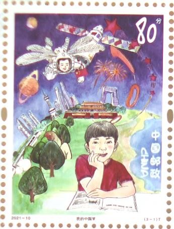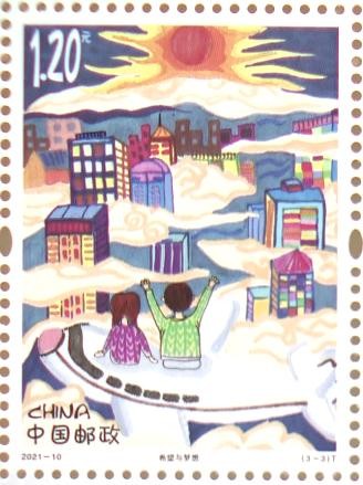 第一枚邮票通过描绘我国航空航天事业、城市交通网络繁荣发展等场景,表达了少年儿童不断追寻对宇宙探索的梦想以及对未来美好生活的想象与憧憬。