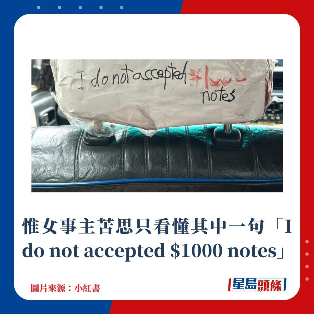 不过,最近有网民于网上分享她的特别经历,女事主早前登上一架的士前座的椅背均贴上不同的英文标语,她尝试解读背后意思,惟只看懂司机不收$1000元纸币,其余4句没有逻辑及前文后理,令她不得不到网上求救。
