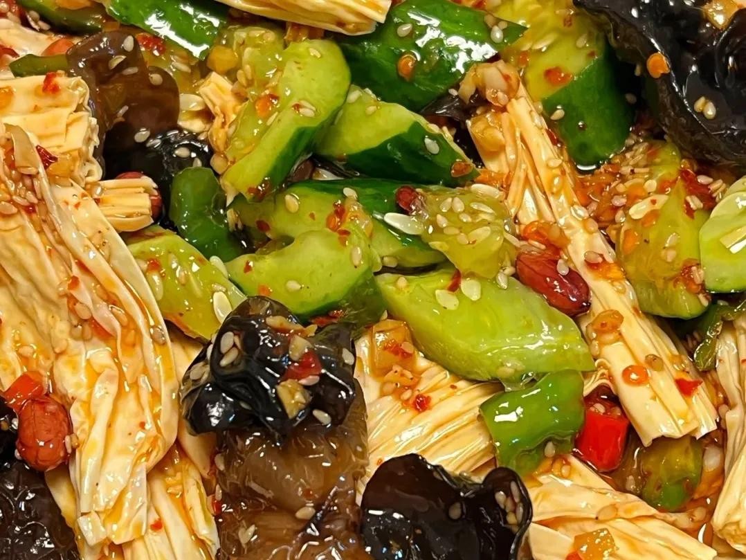 准备食材:黄瓜,腐竹,木耳,蒜末,小米辣,花生米,白芝麻,生抽,白醋,蚝油,香油,白糖,食盐,食用油。