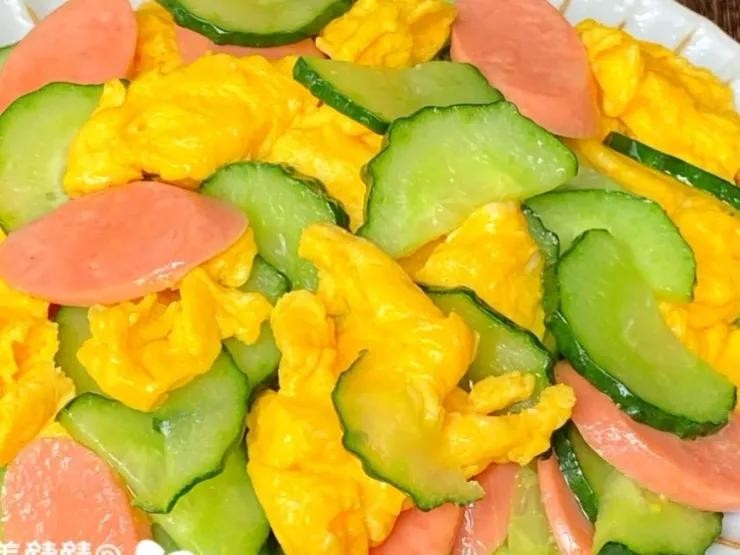 1、黄瓜清洗干净,对半切开,再切成薄片。火腿斜切成薄片,鸡蛋打入碗中搅散备用。