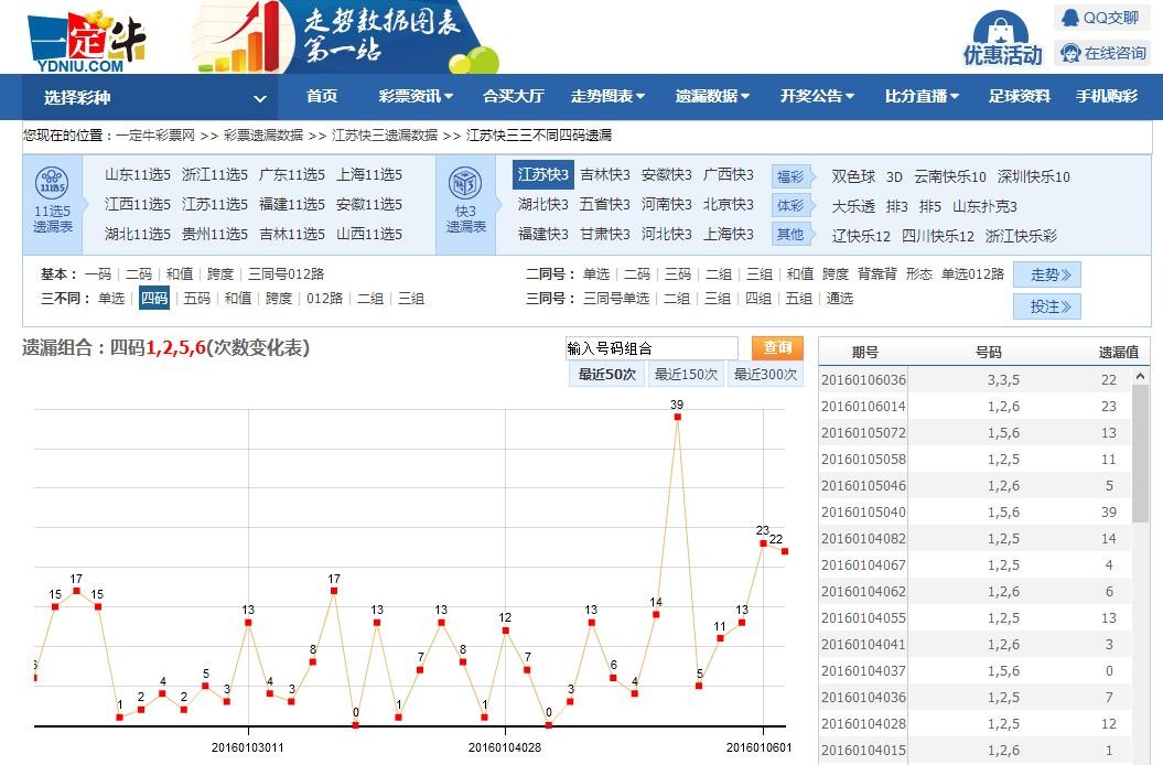 (一定牛遗漏图表,四码组合1256最近50次开出最大的遗漏是39次)