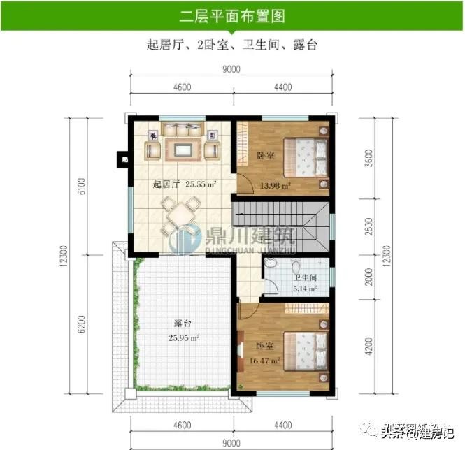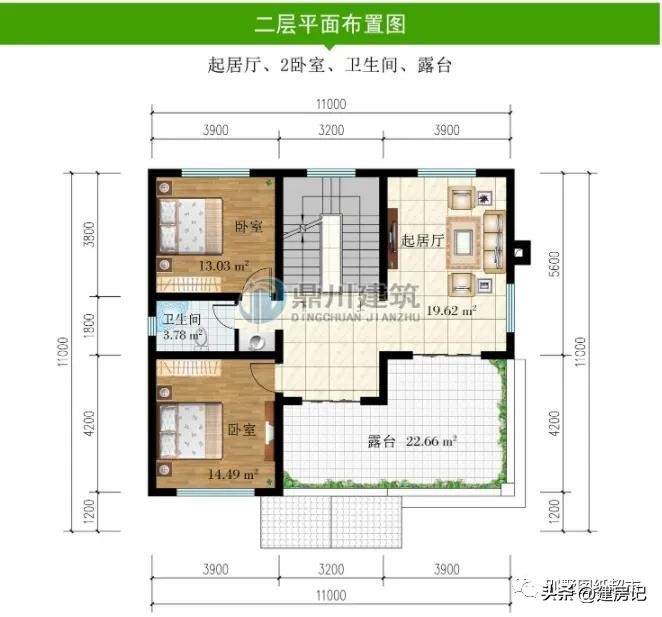 二 层:起居厅、2卧室、卫生间、露台