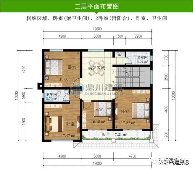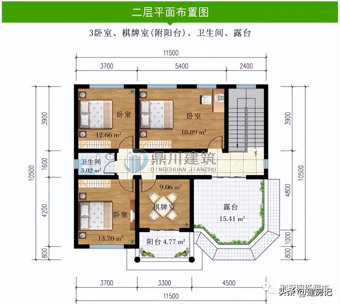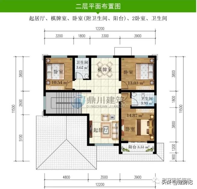 二 层:3卧室、棋牌室(附阳台)、卫生间、露台