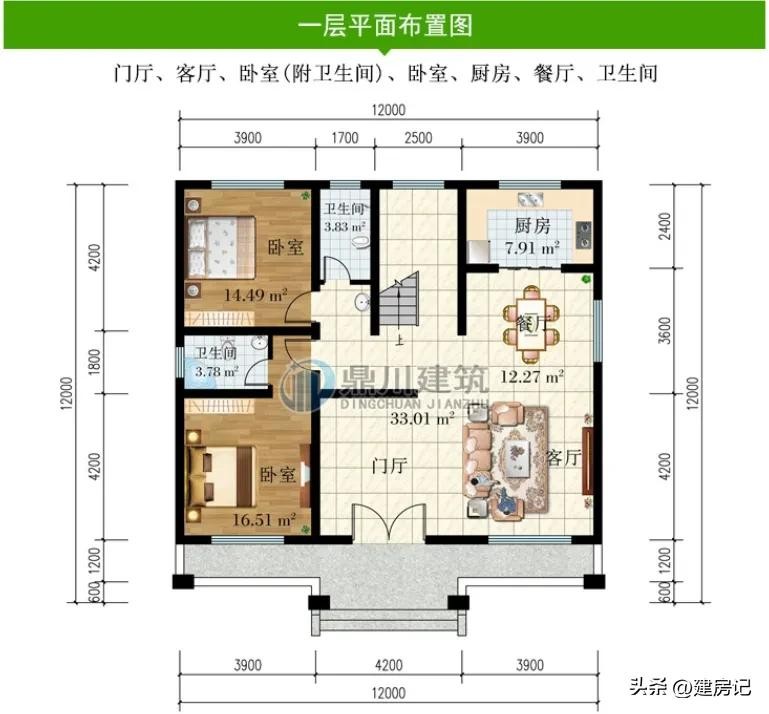 一 层:门厅、客厅、2卧室、厨房、餐厅、卫生间
