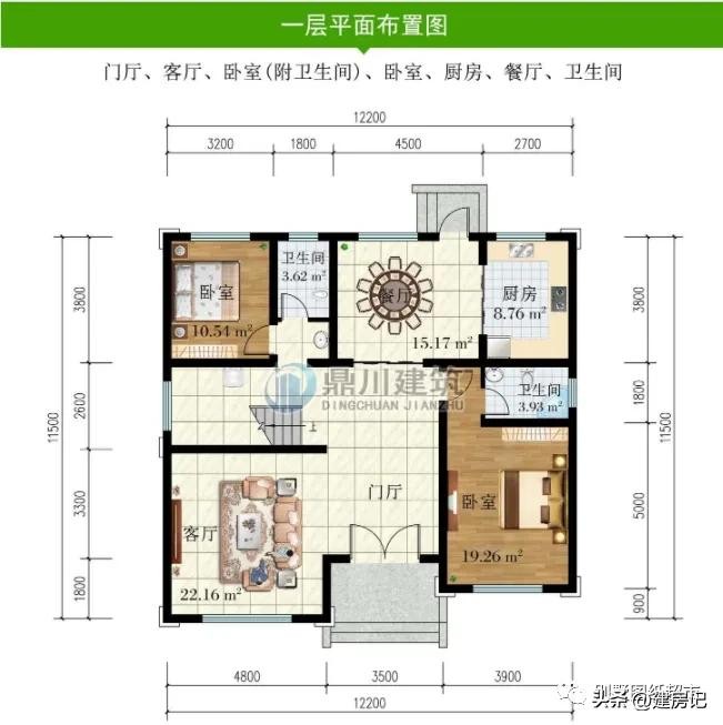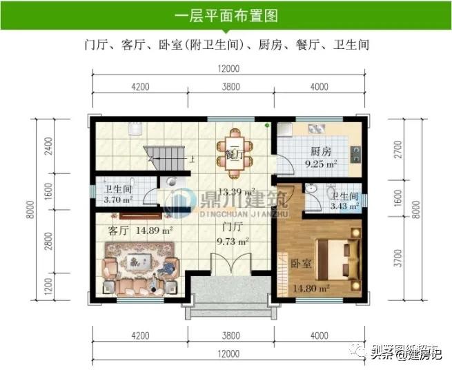 一 层:门厅、客厅、卧室(附卫生间)、厨房、餐厅、卫生间