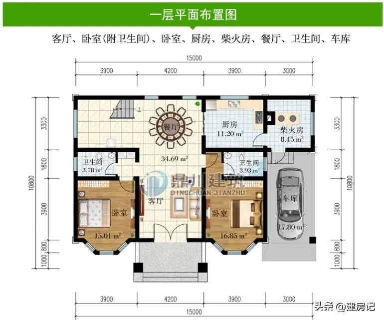 一 层:客厅、卧室(附卫生间)、卧室、厨房、柴火房、餐厅、卫生间、车库