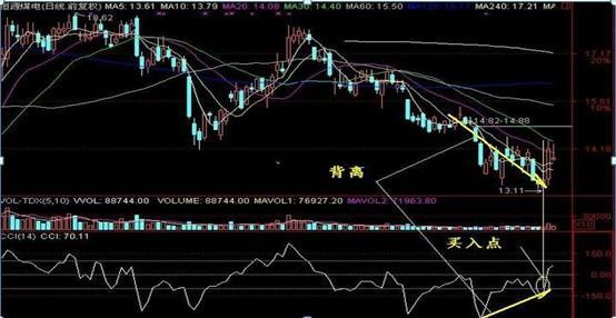 在CCI顺势指标线已经一次或多次CCI跌到-100下方折回后,当股价继续下跌时,CCI顺势指标虽然又跌至-100下方,但下探深度低于前面,出现了CCI两底连线方向向上,与股价的连线向下方向相反的背离情况,可以在上穿-100地线时买入。