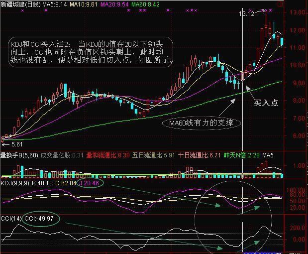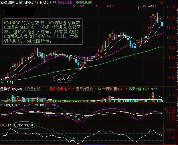 案例1:大家可以看下图的买入点位置,在买点出现之前,KDJ的J值为负数,CCI值在负200左右,此时不是介入的时机,当J线和CCI两线第一从负值去拐头向上是,才是切入的最好时机。