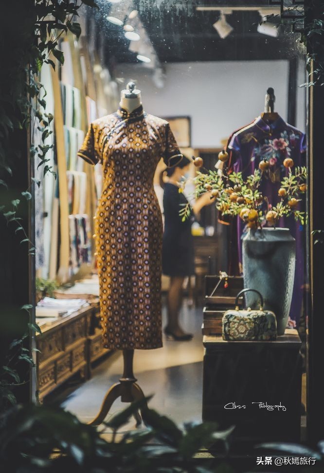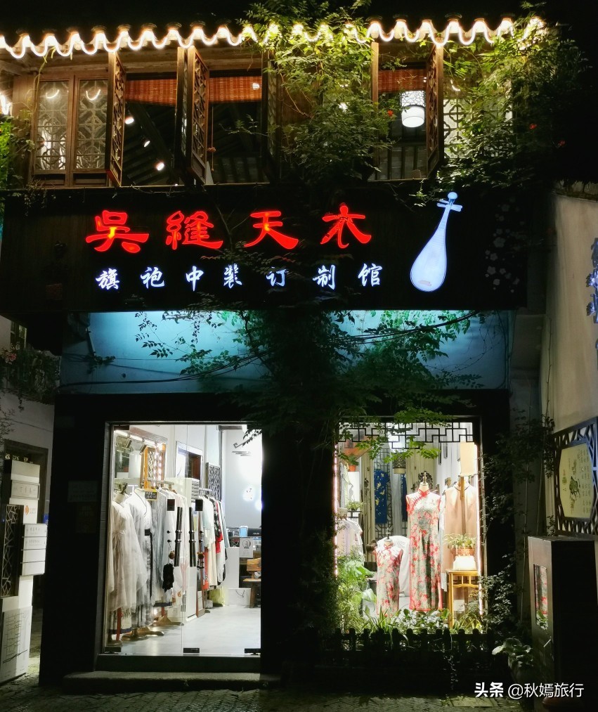 走在夜色中的平江路,是一种享受。商店里灯火璀璨,衣架上挂着一袭袭华美旗袍,丰姿绰约,尽显妖娆。