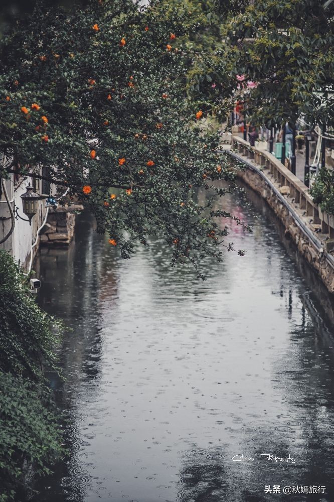 伸展在河面上的石榴花,被雨水冲刷得分外红艳。雨中的江南水乡似乎更有韵味。