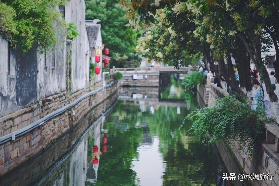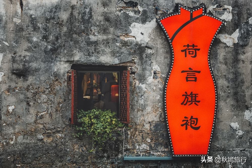 站在古桥上眺望,轻轻流淌的河水,纵横交错的巷道;粉墙黛瓦的民居,悬挂的大红灯笼,斑驳墙面上鲜艳的旗袍图样,以及郁郁葱葱的绿叶,构成了一幅典型的江南水乡风情画卷。