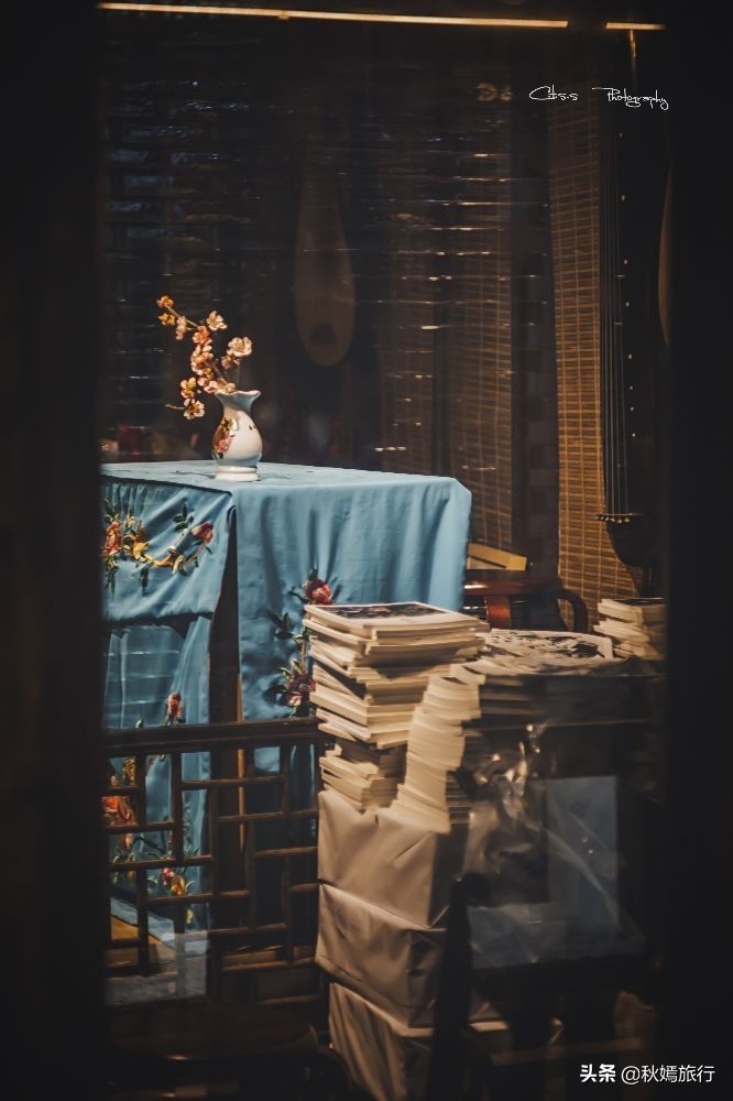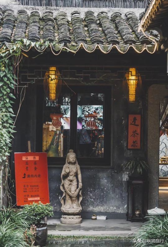 餐馆临河,白墙黛瓦,木栅花窗,灯笼悬挂。老墙斑驳,却如丹青淡剥,好似诗意盎然的国画。在这里品一杯清茶,听一折昆曲评弹,便是最江南。