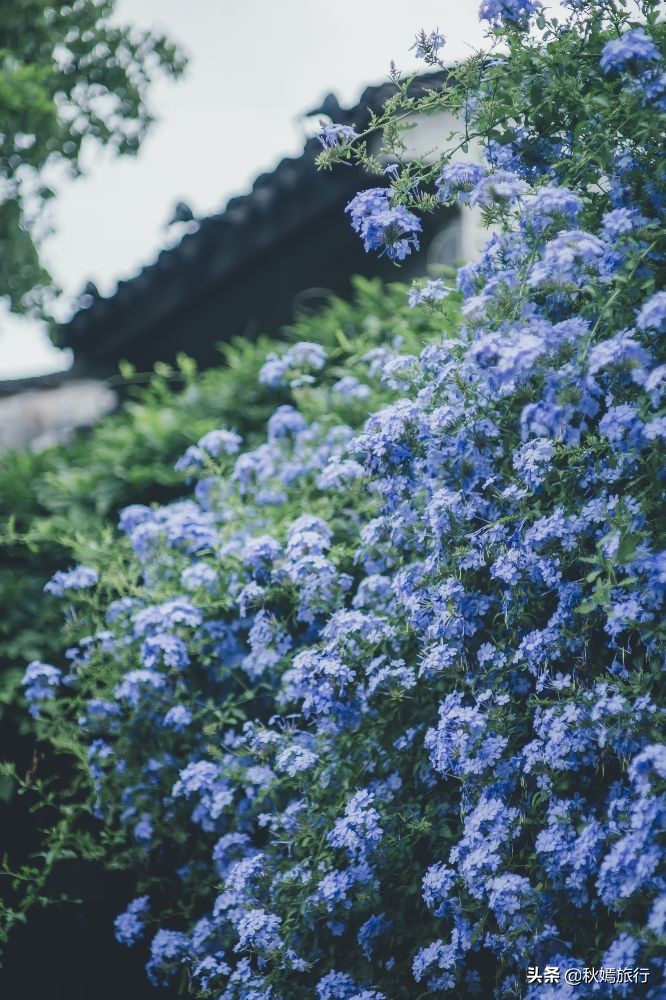 杂货铺前,一丛蓝花丹就这样惊艳地绽放街头,独特的青蓝色很吸引路人。蓝莹莹的花朵淡然、娴静,娇媚动人,与平江路雨后清新、雅致的气息很相配。