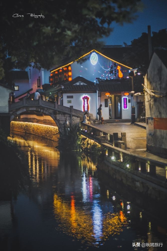 不知不觉,华灯初上。平江路沿街店铺门前、屋檐下,橘黄色的灯光逐次点亮,映着浓密绿叶,散发出迷人的幽光。五光十色的灯火倒映在水中,仿佛置身于一个光影陆离的梦幻世界。