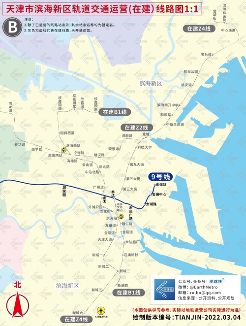 从图上就能看出,未来天津的发展着重倾向了滨海新区。仅在滨海新区就有两条全线在滨海新区界内的运行的地铁线路(在建B1线、在建Z4线)规划,可以明显感受到未来的滨海新区充满活力。