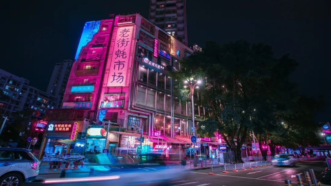 入夜后的布吉河畔,七彩霓虹灯牌点缀下的深圳文和友,像繁华都市进行曲里一段复古怀旧的浪漫旋律。
