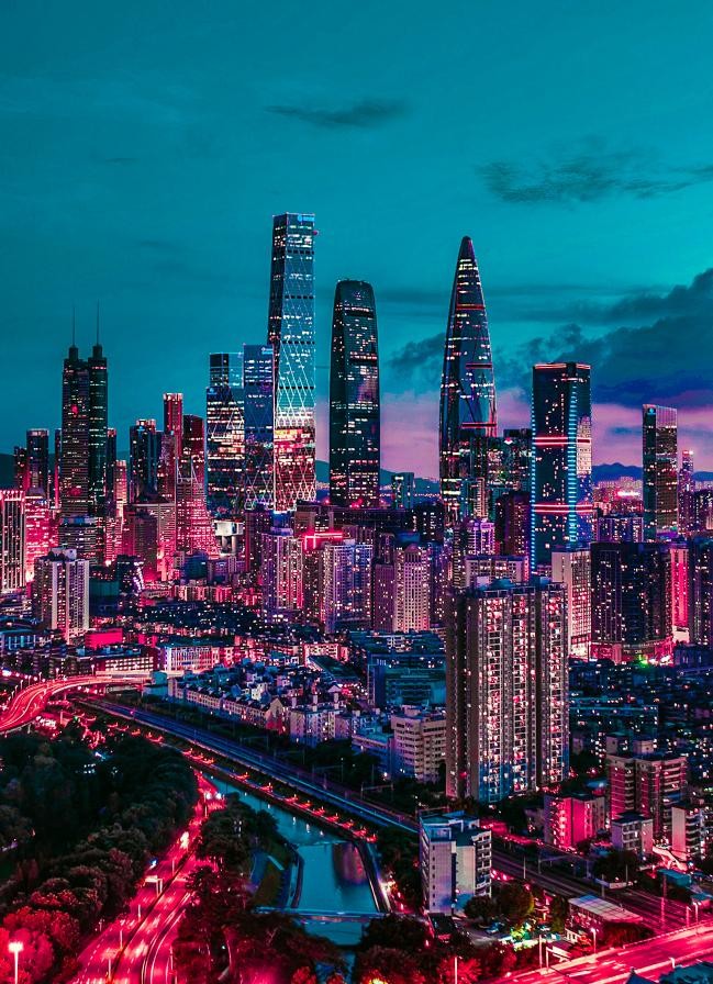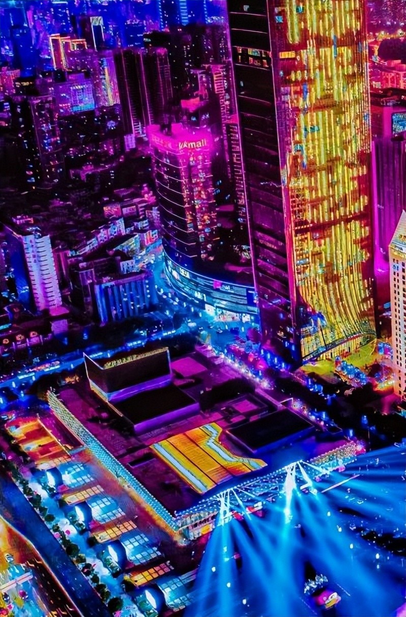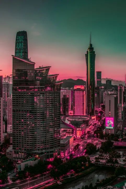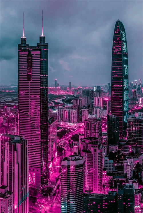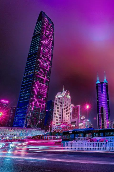 京基100和地王大厦,并肩立于深南东路,每逢节假日,霓虹绽放,流光溢彩,就像是罗湖夜色中最璀璨的“双子星”。用赛博朋克滤镜打开TA们,耀眼的摩天大楼“变身”未来都市的魔幻巨厦,视觉效果拉满~
