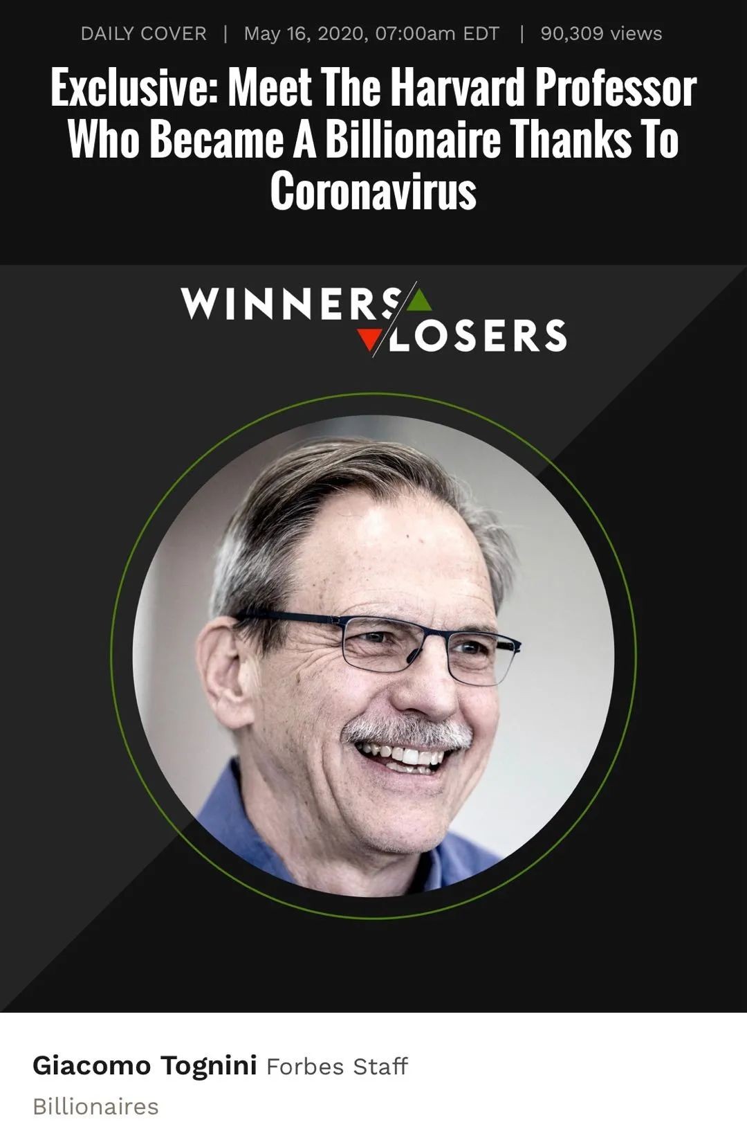 同一场疫情下有幸运儿。哈佛生物教授Timothy Springer在2010年约用五百万美元投资了一家叫Moderna的公司。对,就是美国目前两大新冠疫苗生产公司之一。而作为首轮投资人,他的股票如今已经价值10亿美元。