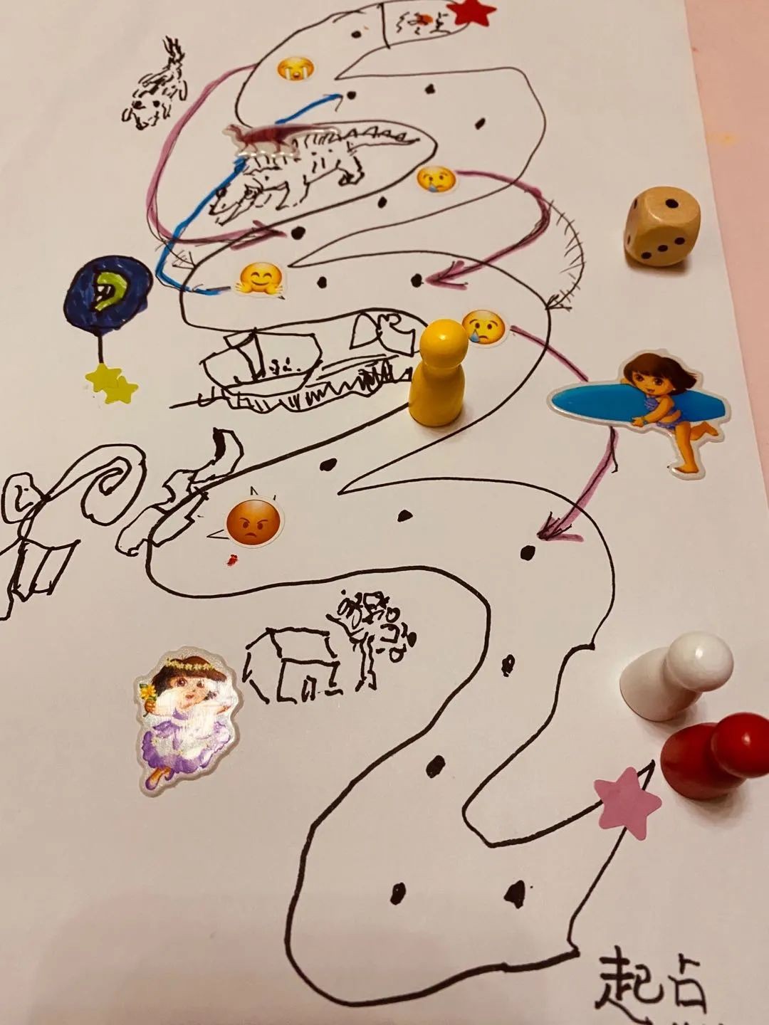 前几天,我和小AI在家自制了一个棋盘,还设置了一些小机关。我设计的想法是:别以为骰子扔得大,就一定会笑到终点哦。