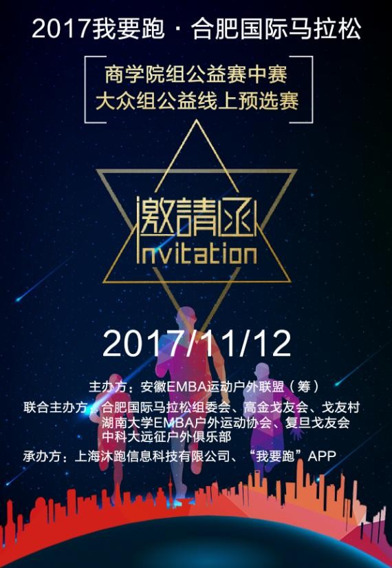 2017年合肥马拉松商学院公益赛中赛号召了全国多家知名EMBA商学院及组织共同加入,本次比赛由安徽EMBA运动户外联盟(筹)主办,由合肥国际马拉松组委会、高金戈友会、戈友村、湖南大学EMBA户外运动协会、复旦戈友会、中科大远征户外俱乐部联合主办,由上海沐跑信息科技有限公司、“我要跑”APP承办。